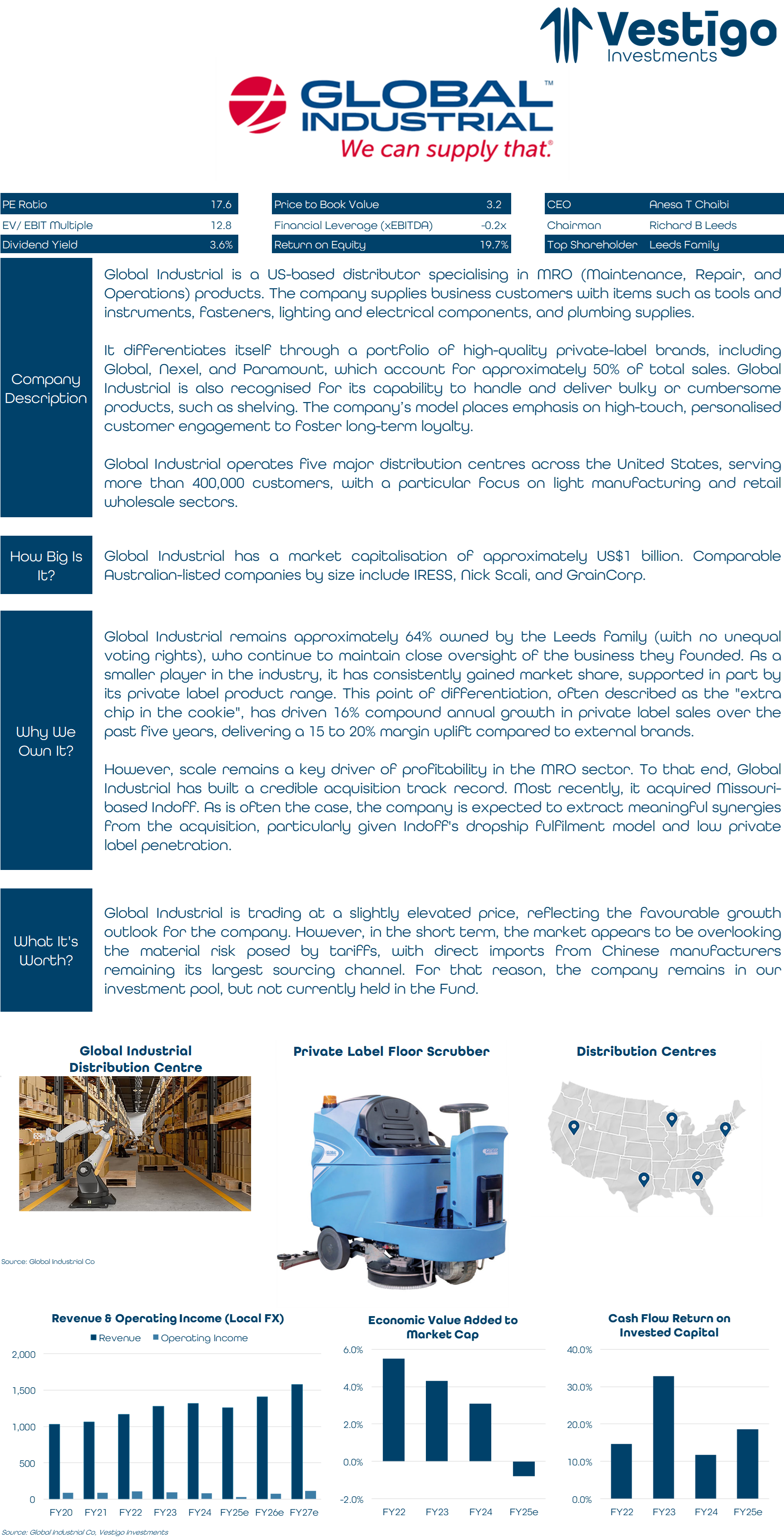 Global Industrial is a US-based distributor specialising in MRO (Maintenance, Repair, and Operations) products. The company supplies business customers with items such as tools and instruments, fasteners, lighting and electrical components, and plumbing supplies.